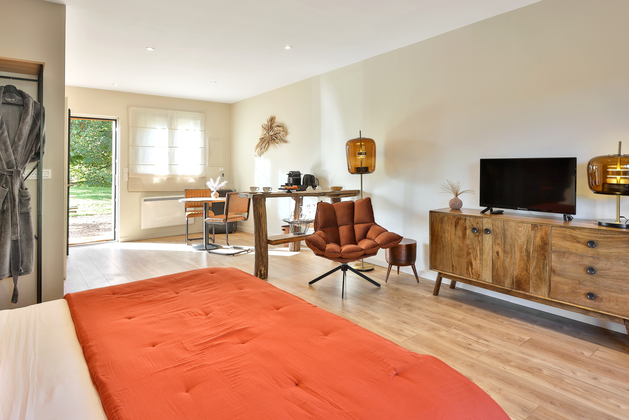 Pour votre confort, les serviettes de bain, les peignoirs et les chaussons sont à disposition dans votre chambre. La chambre d’une superficie de 45 m2 a une entrée indépendante donnant directement sur le jardin.