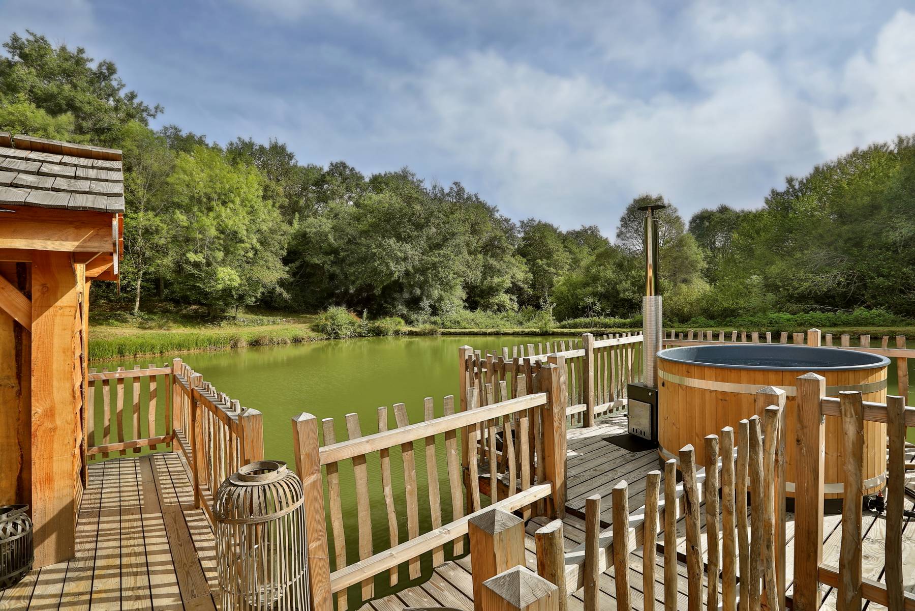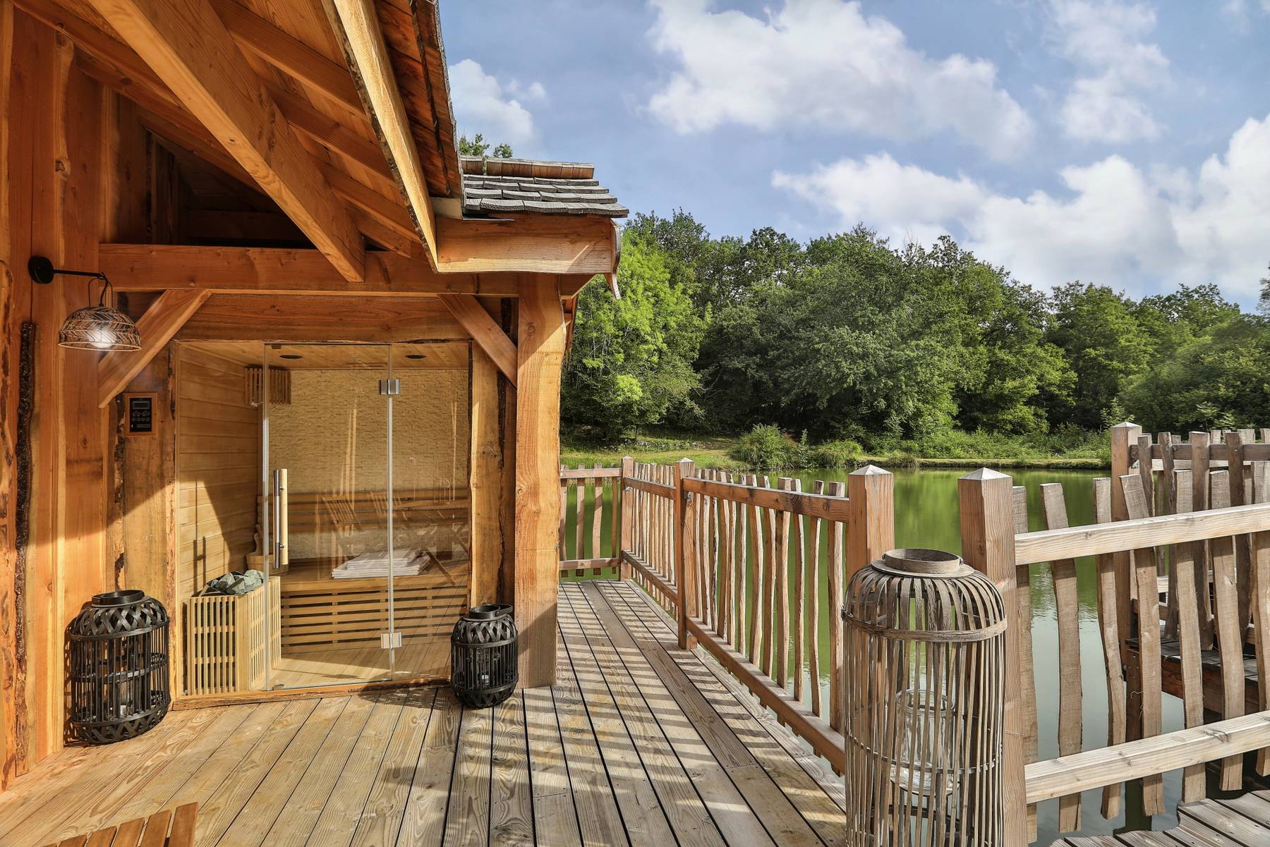 Experience an unusual night in the Cabane du Lac de La Mandrélie in a comfortable, romantic and cosy atmosphere. The Cabane Spa du Lac is a floating cabin located in the middle of nature on a 45 hectare estate between Bergerac and Périgueux with a breathtaking view of the surrounding countryside. It is equipped with a high quality king size bed and linen, bathroom with Italian shower, large sink, separate dry toilet, heating and air conditioning, mini bar, Nespresso coffee machine. Enjoy the sauna and the Nordic bath on your terrace for a relaxing stay and come and admire the magnificent sunsets.